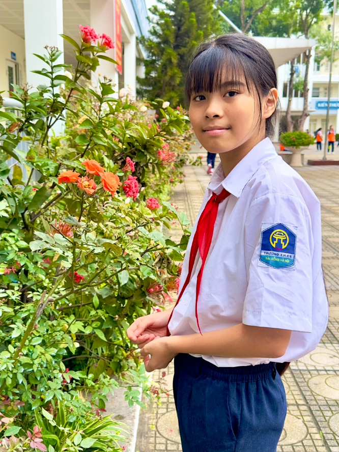 Bạn Châu ở lớp luôn mang trên mình hình tượng một cô thiếu nữ trưởng thành hơn so với các bạn một chút nhưng tuy vậy,ngọn lửa trẻ trong bạn vẫn mãi thắp sáng và không bao giờ dập tắt!Thân thiện và hòa nhã với các bạn trong lớp,lễ phép và nghe lời thầy cô là những từ ngữ chúng em dùng để nói mỗi khi nhắc về bạn ấy.Mỗi ngày đến trường là lại nhìn thấy hình ảnh bạn học sinh với mái tóc dài và bộ đồng phục được là phẳng phiu,trông rất ngăn nắp và gọn gàng!
